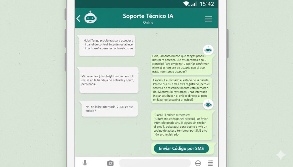 Nuestro Asistente Virtual está operativo las 24 horas para ayudarte con cualquier incidencia técnica, como problemas de login o restablecimiento de contraseñas. Verás cómo nuestra IA te guía paso a paso con soluciones directas y alternativas, como el envío de un código SMS, reduciendo drásticamente el tiempo de espera. Mejora tu experiencia y recupera el control de tu panel en segundos.